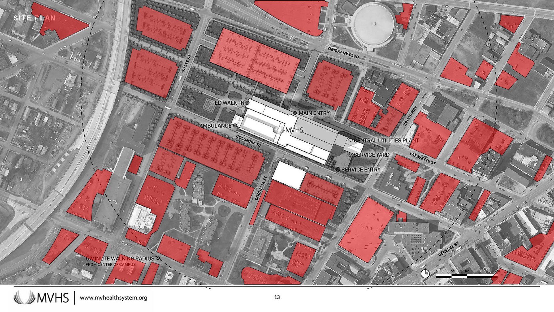 (2) Is MVHS going to continue using the vacant Utica National building for administration? If so, including that block adds an additional 2.04 acres to the hospital footprint.