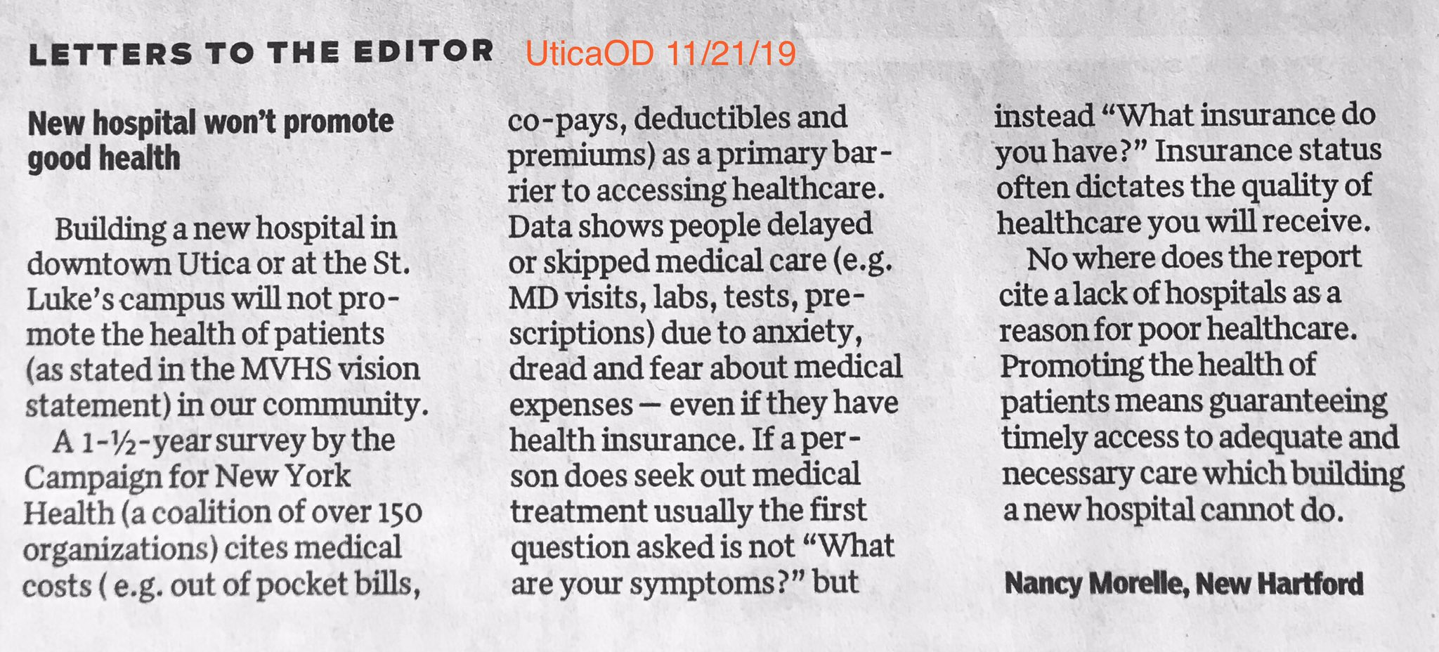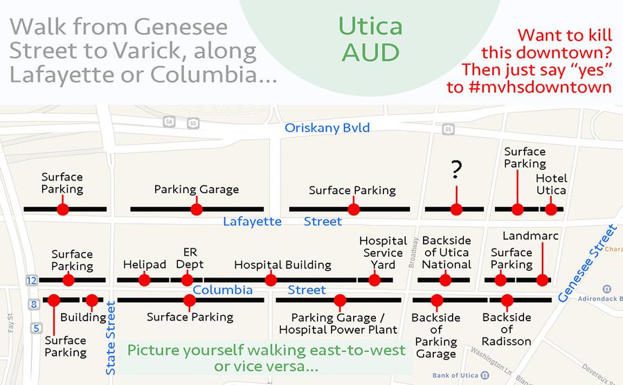 Since late 2014, hospital administrators and politicians have been prognosticating a new building is what’s needed, November 19, 2014 - Mohawk Valley Health CEO: New Hospital 'Worth Exploring. However this November 2019 Opinion (for example, one of MANY) highly questions a need for a new building. Touted as an economic development driver for Downtown Utica, the "super block" design would destroy the street grid and neighborhood walkability.