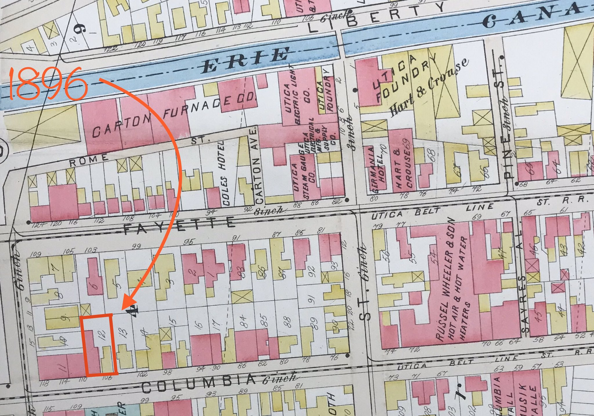 The following 1986 map shows numerous buildings of both wood (yellow) and brick (red) construction. They're mainly located where the present day Utica Police maintenance garage is located...